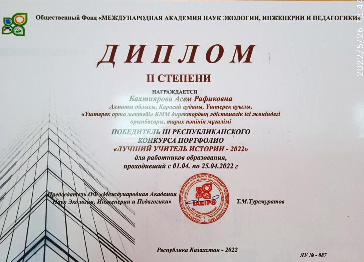 "Тарих пәнінің үздік мұғалімі" -2022 атты Республикалық партфолио конкурсының жүлдегері Үштерек орта мектебінің директоры әдістемелік ісі жөніндегі меңгерушісі, тарих пәнінің мұғалімі Бахтиярова Асем Рафиковна марапатталды. » Үштерек орта мектебі