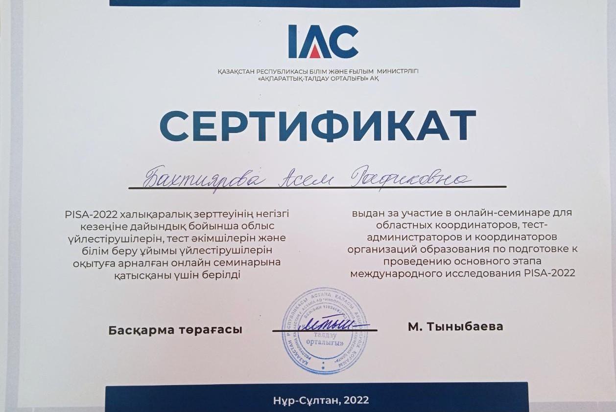 ICILS-2022 Халықаралық зерттеуінің апробация кезеңіне дайындық бойынша облыстық үйлестірушілерін, тест өткізуші тұлғаларын және мектеп үйлетірушілерін оқытуға арналған онлайн семинарынақатысқаны үшін Үштерек орта мектебінің оқу әдістемелік ісі жөніндегі орынбасары Бахтиярова Асем Рафиковнаға Сертификат берілді