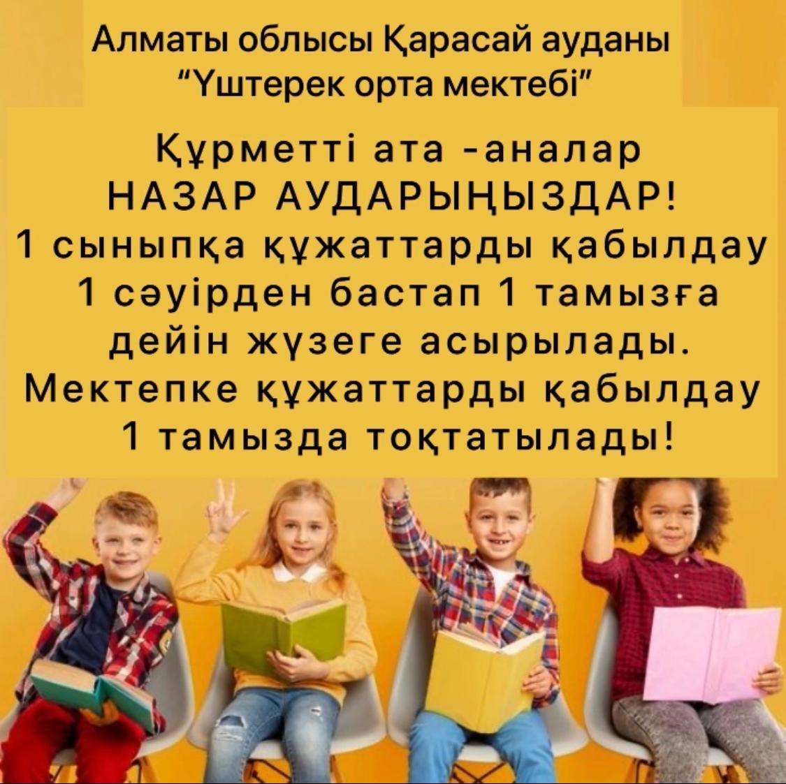 Бірінші сыныпқа қабылдау 2022  жылдың  1-сәуірінде басталған болатын. Құжаттарды қабылдау ағымдағы жылдың 1- тамызында аяқталады. Құжаттар «электрондық үкімет»  веб-порталы  арқылы  қабылдануда. Ата-аналар құжаттарды дәстүрлі форматта да тапсыра алады. Құрметті  ата-аналар! Құжаттарды тезірек тапсыруға кеңес береміз.