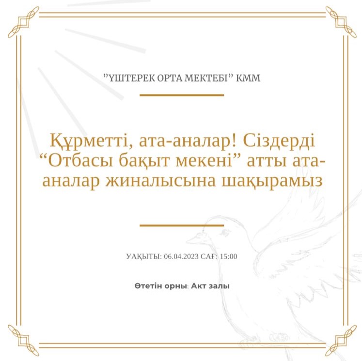 05 апрель 2023 0 1 2 3 4 5 Үштерек орта мектебі ата-аналарға арнап "Отбасы бақыт мекені" атты ата-аналар жиналысына шақырады