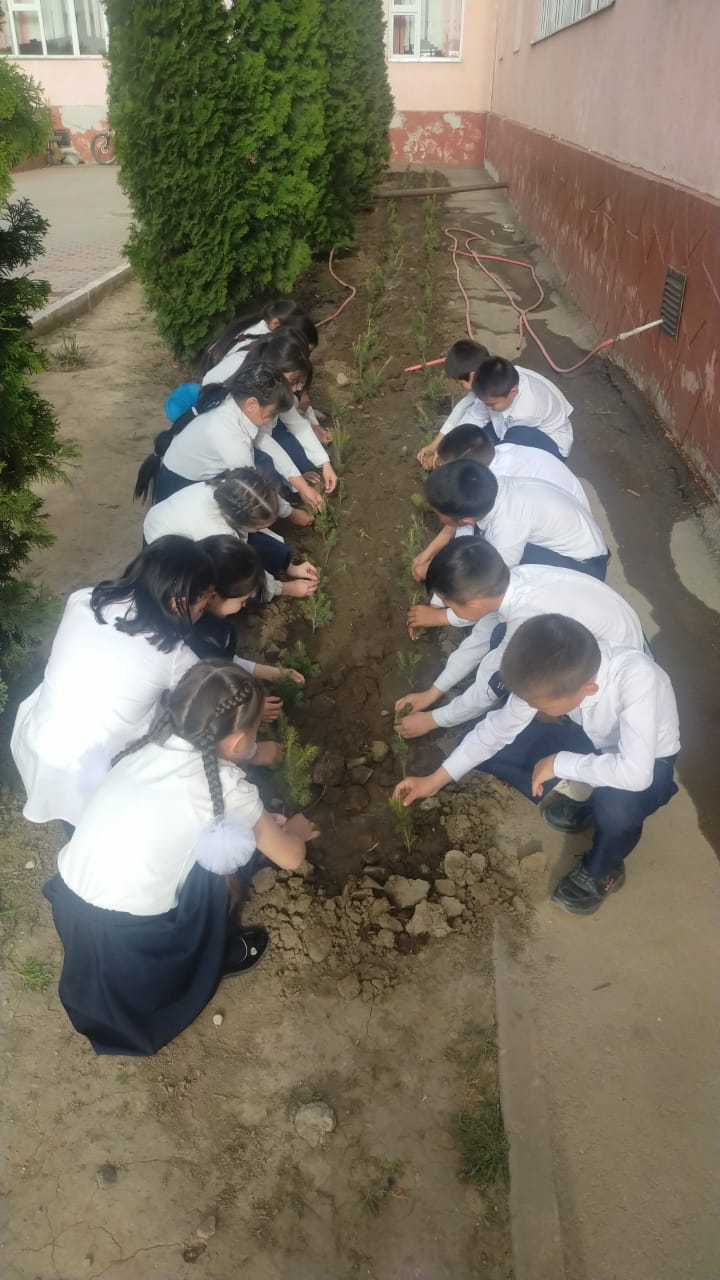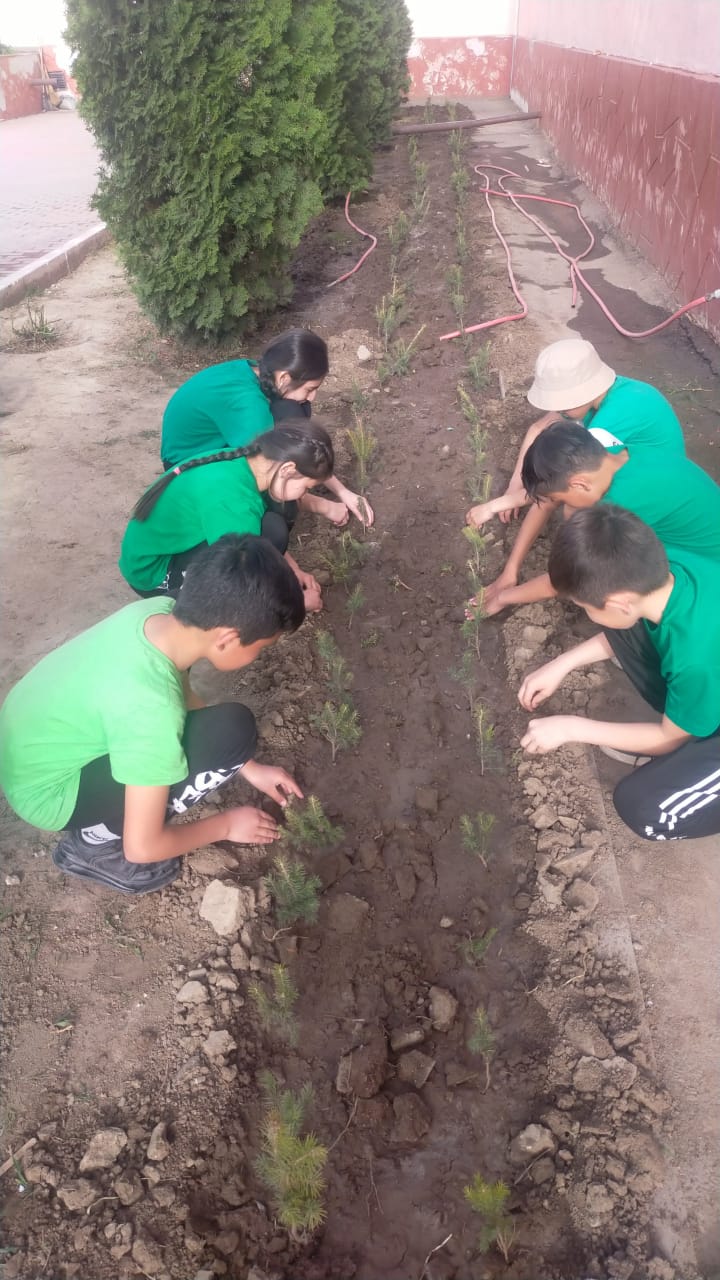 "Жасыл ел" жобасы аясында көгалдандыру жұмысын жасау бағытында мектеп оқушылары үнемі белсенділік танытып отырады.Мектебіміздің ауласына 100 шырша көшеттері отырғызылды.Көшеттер отырғызу,экологияны ластамау,ауланы тазалау жұмыстары әлі де өз жалғасын табуда💪💪💪👍👍