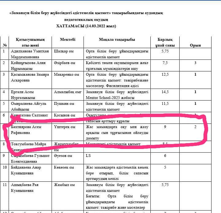 Қарасай ауданы білім бөлімінің ұйымдастыруымен «Заманауи білім беру жүйесіндегі әдістемелік қызмет» тақырыбындағы аудандық педагогикалық оқу байқауында Үштерек орта мектебі директордың әдістемелік ісі жөніндегі орынбасары Бахтиярова Асем Рафиковна жүлделі II- орын иеленді.