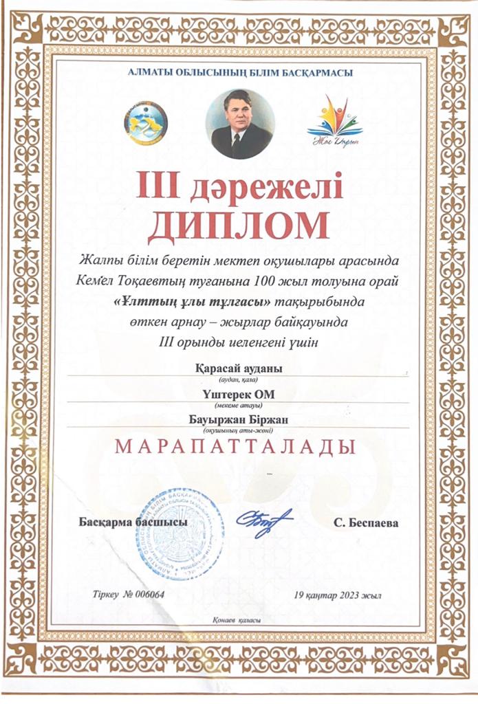 өткен арнау - жырлар байқауында III орынды иеленгені ушін Үштерек орта мектебінің 9-сынып оқушысы Бауыржан Біржан ІІІ ДәрежеліДипломмен марапатталды.