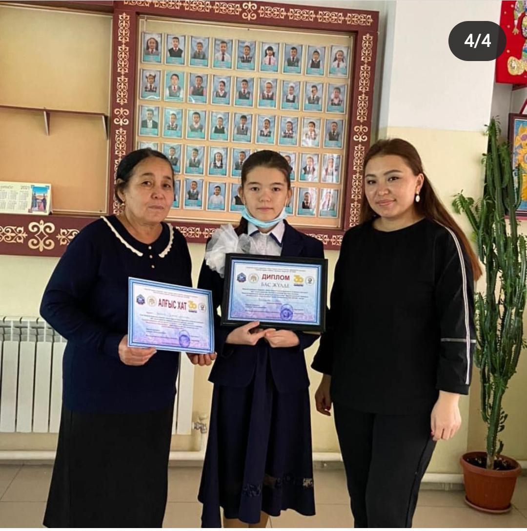 Қарасай аудандық мәдениет үйінің парасаттылық мәдениетін ілгерілету жөніндегі 2021 жылға арналған кешенді іс-шаралар жоспары аясында,"Қарасай ауданының жастар ресурстық орталығымен "бірлесе өткізілген аудандық "Жемқорлықты жеңу жолдары"байқауының "Бас жүлде" иегері Үштерек орта мектебінің  9 "А"сынып оқушысы Қойбақова Әсем марапатталды.